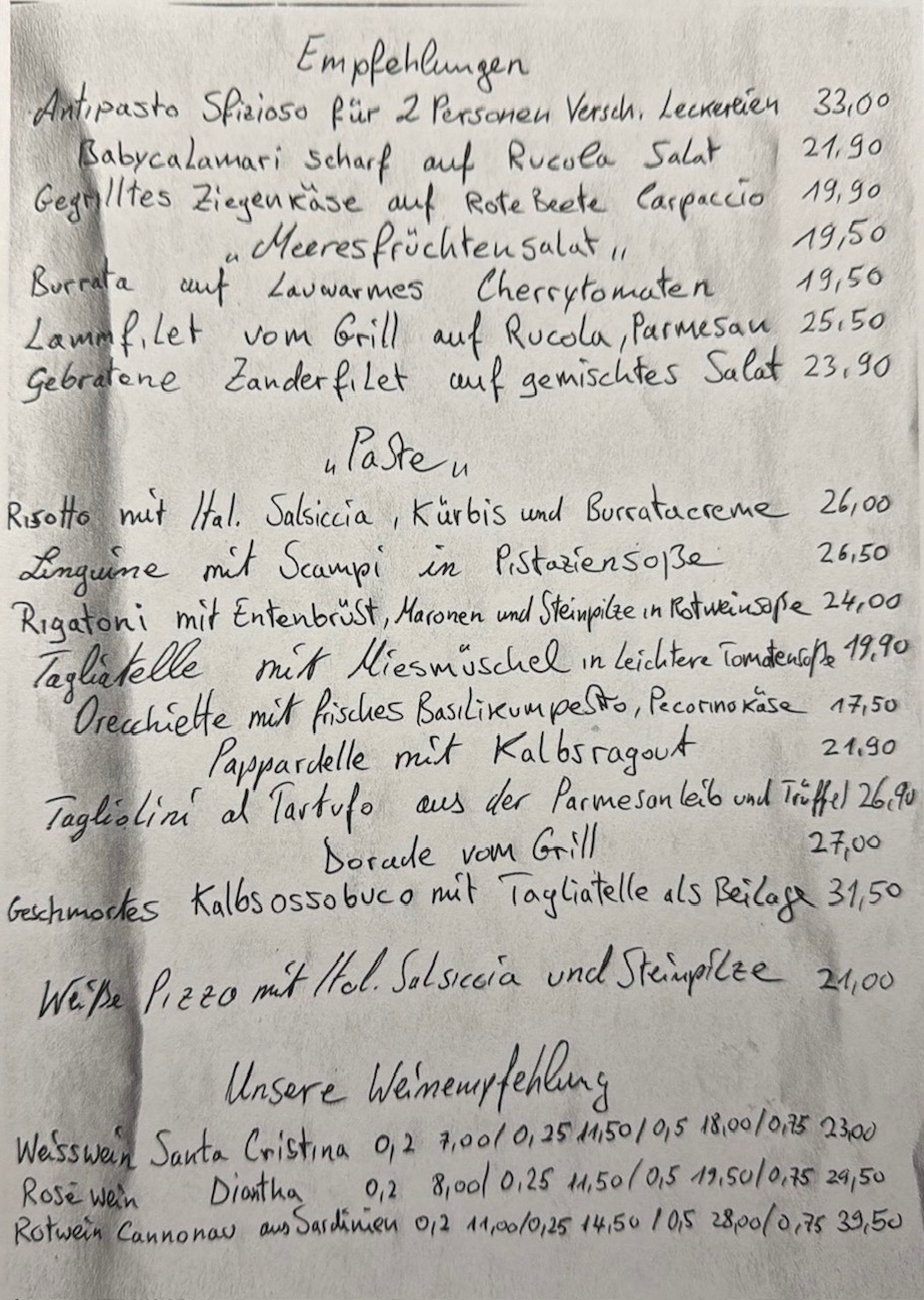 Speisekarte Nachfolgend finden Sie unsere aktuelle Speisekarte. Unsere Pizza – und Pastagerichte gibt es auch zum Mitnehmen Unsere aktuelle WOCHENKARTE:Herunterladen Unsere aktuelle Speisen- & Getränkekarte:Herunterladen